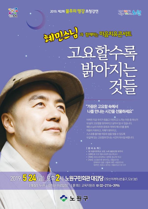 [시민일보=황혜빈 기자] 서울 노원구(구청장 오승록) 구민회관 대강당에서 '혜민 스님 특강'이 오는 24일 오후 2시에 개최된다.
