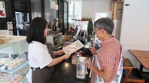 | ▲ 커피전문점에서 1회용 플라스틱 컵 사용 여부에 관해 지도 점검을 실시하고 있다. (사진제공=강동구청) | ||