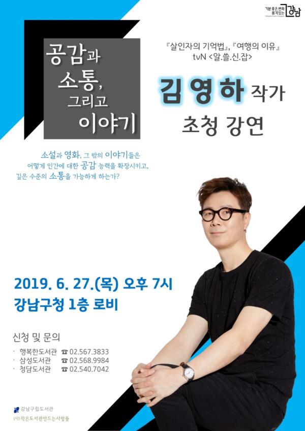 [시민일보=이대우 기자] 서울 강남구(구청장 정순균)가 오는 27일 오후 7시 구청 본관 1층 로비에서 한국 현대문학의 대표 중견작가인 김영하씨를 초청해 ‘공감과 소통, 그리고 이야기’ 강연회를 개최한다.