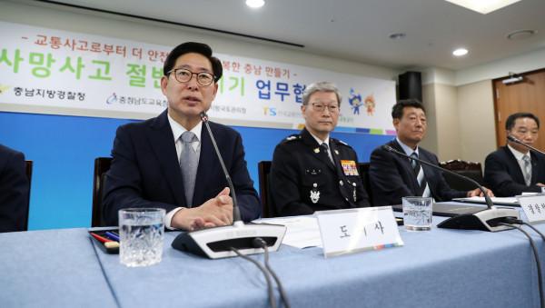 이를 위해 20일 양승조 도지사는 도청 상황실에서 김지철 도교육감, 박재진 도경찰청장, 김선태 대전지방국토관리청장, 송병호 한국교통안전공단 대전충남본부장, 주두환 도로교통공단 대전세종충남지부장 등과 '교통사망사고 절반 줄이기 업무협약'을 체결했다.