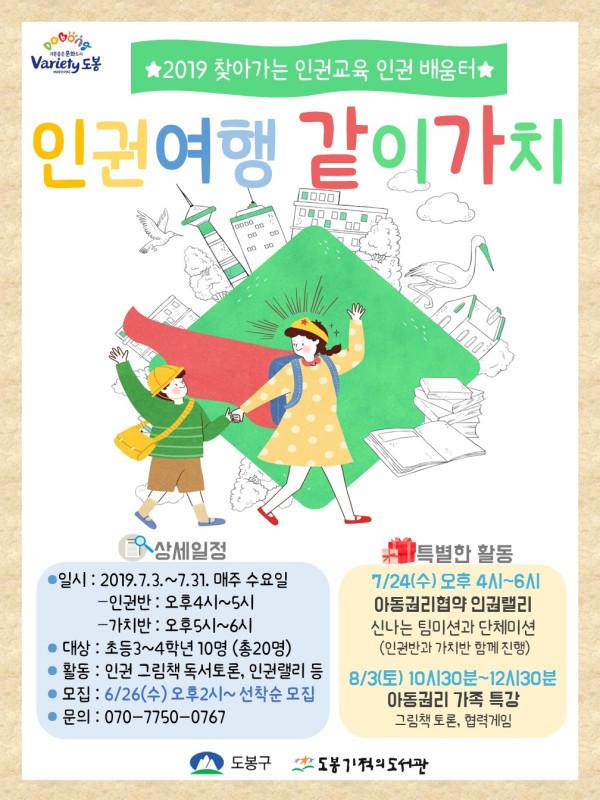 [시민일보=황혜빈 기자] 서울 도봉구(구청장 이동진)는 오는 7월3일부터 도봉기적의도서관과 연계해 책을 활용한 인권교육 프로그램 ‘인권여행 같이가치’를 운영한다고 밝혔다.