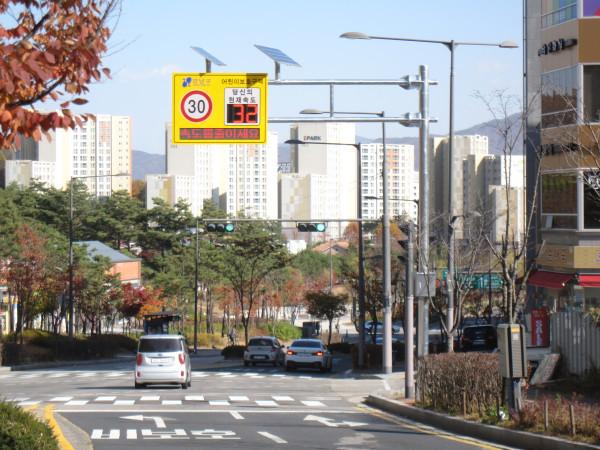 | ▲ 자곡초등학교 앞 태양광 과속경보시스템. (사진제공=강남구청) | ||