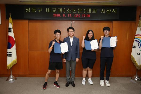 | ▲ 2018년 고교생 진로 심화주제 발표대회 수상자들과 정원오 구청장(왼쪽에서 두 번째)이 기념촬영을 하는 모습. (사진제공=성동구청) | ||