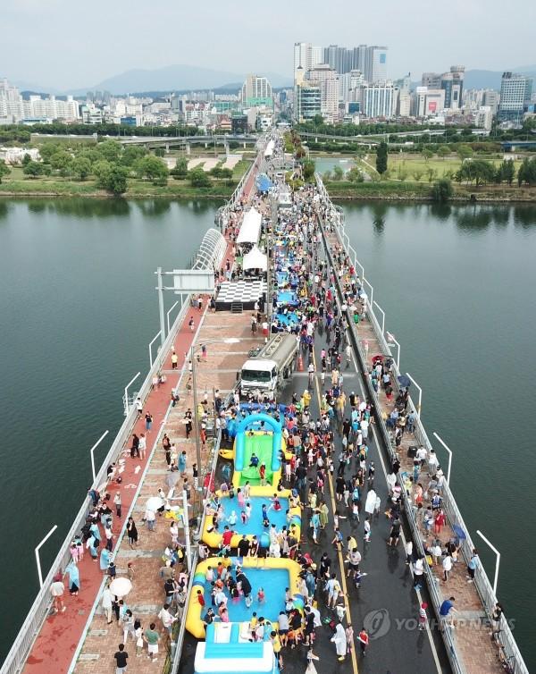 지난 29일 오후 강동구 광진교 위에서 광진교 물총축제가 진행되고 있다.