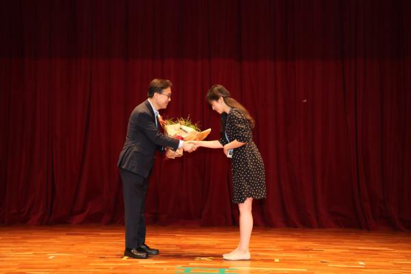 서울 금천구는 민선7기 취임 1주년을 맞아 1일 오전 8시30분 구청 대강당에서 직원 ‘정례조례’를 개최했다. 사진은 유성훈 구청장(왼쪽)이 직원 정례조례에서 축하 꽃다발을 받고 있는 모습.(사진제공=금천구청)
