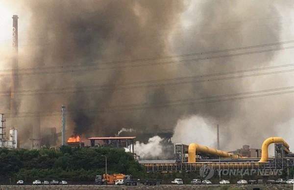 1일 오전 전남 광양시 태인동 포스코 광양제철소에서 정전이 발생해 굴뚝에 설치된 안전장치인 블리더(bleeder)가 열리면서 불꽃과 검은 연기가 치솟고 있다.