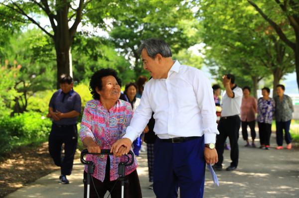유근기 전남 곡성군수가 최근 주민들이 조성한 ‘행복한 마을 꽃길’ 11곳 중 2곳을 방문해 참여 주민들과 함께 걸으며 소통 행보를 이어나갔다. 사진은 마을 꽃길에 방문한 유 군수가 노인과 함께 걸으며 정답게 이야기를 나누는 모습. (사진제공=곡성군청)