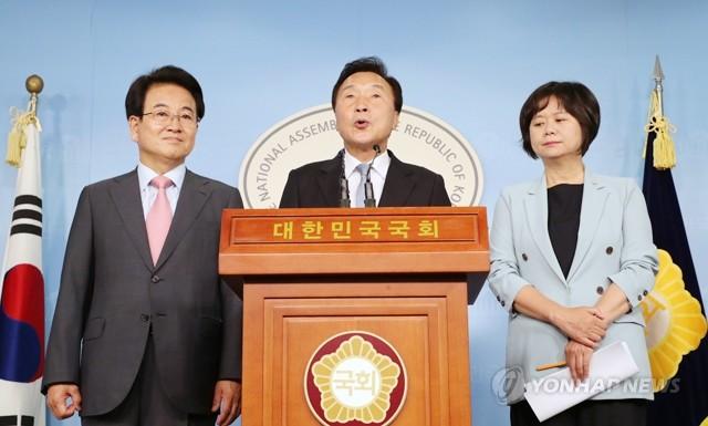 정의당 이정미(오른쪽부터), 바른미래당 손학규, 민주평화당 정동영 대표가 2일 오전 국회 정론관에서 선거제도 개혁과 패스트트랙 법안 처리 완수를 촉구하는 긴급기자회견을 하고 있다.