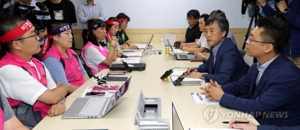 2일 오후 서울 강남구 스마트워크센터에서 총파업을 앞두고 열린 교육당국-학교비정규직연대회의간 막판 협상에서 교육당국 측 김선욱 광주광역시교육청 과장이 발언하고 있다.