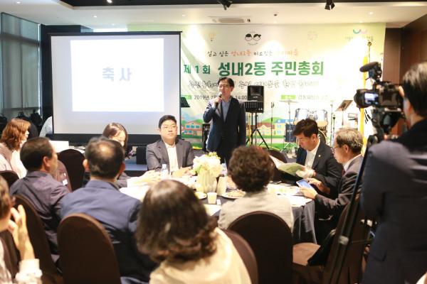 이정훈 강동구청장은 최근 KDW웨딩홀에서 성내2동 주민자치회 주민들과 함께 주민자치회 운영 현황을 공유하고 오는 2020년 동 자치계획을 의결하는 주민총회에 참석했다. 사진은 이날 주민총회에 참석한 이 구청장이 축사를 하는 모습. (사진제공=강동구청)