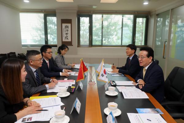 [시민일보=이대우 기자] 정순균 강남구청장이 20일 오전 10시 구청 본관 3층 제1작은회의실에서 열린 ‘중국 상하이시 푸둥신구 대표단 방문간담회’에 참석해 푸둥신구와 앞으로 실질적인 교류사업을 추진, 자매교류도시로의 발전에 대해 논의했다. 사진은 송 지안동(宋建东) 상하이시 푸둥신구인민정부 교류협력처 부처장 등 대표단과 간담을 나누고 있는 정 구청장(왼쪽)의 모습.