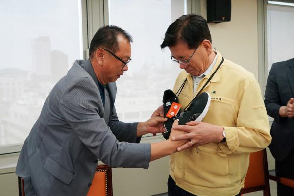 지난 2일 유덕열 서울 동대문구청장이 동대문구공무원노동조합으로부터 ‘새 신발을 신고 직원과 함께 발로 뛰는 동대문구의 일꾼이 되기를 바란다’는 의미로 새 운동화를 선물받았다. 사진은 선물을 받고 있는 유 구청장(오른쪽)의 모습.(사진제공=동대문구청)