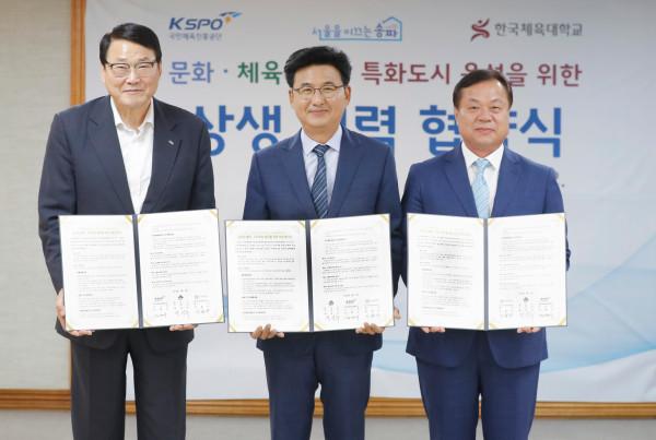 박성수 서울 송파구청장이 오후 청사 대회실에서 국민체육진흥공단, 한국체육대학교와 함께 '지역사회 발전을 위한 상생 협약식'을 개최했다. 사진은 박 구청장(가운데), 조재기 국민체육공단 이사장(왼쪽),안용규 한국체육대학교 총장(오른쪽)이 협약식 후 기념촬영을 하고 있는 모습.(사진제공=송파구청)