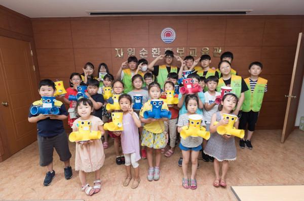 | ▲ 지난해 자원순환체험교실에서 만든 작품을 들고 사진을 찍는 아이들. (사진제공=양천구청) | ||