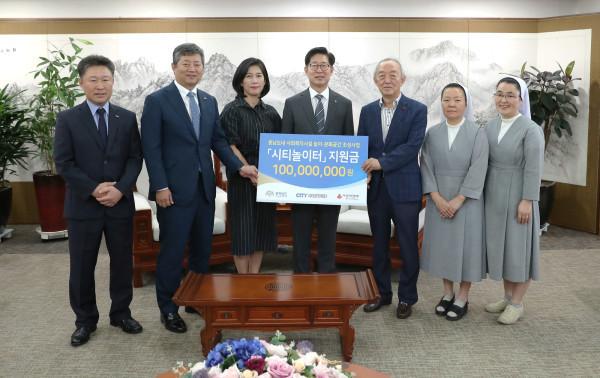 충남도가 8일 도청 접견실에서 시티문화재단으로부터 아동·청소년 복지시설 마련을 위한 기부금 1억원을 전달받았다. 기부금은 태안지역 아동센터 등 4개 기관의 놀이·문화 조성 사업에 투입된다. 사진은 양승조 지사(가운데)와 관계자들의 기념촬영 모습. (사진제공=충남도청)