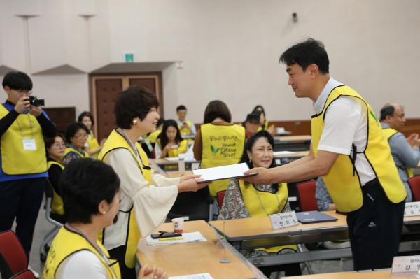 경기 하남시는 최근 시청 대회의실에서 자원봉사자 등 60여명이 참석한 가운데 '드림스타트 꿈누리 봉사단' 발대식을 개최했다. 행사는 선서 낭독, 위촉장 수여, 축사 등의 순으로 진행됐다. 사진은 김상호 시장(오른쪽)이 위촉장을 수여하는 모습. (사진제공=하남시청)