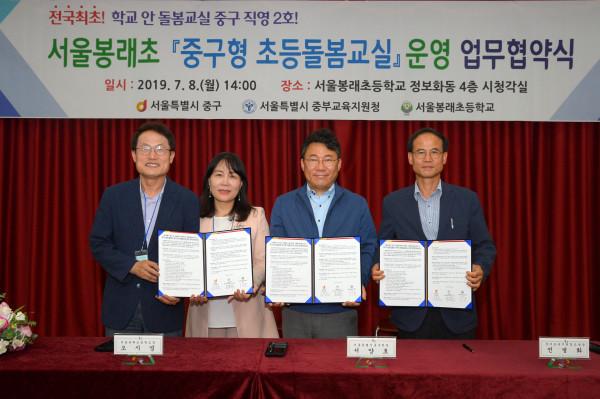 구는 최근 봉래초등학교 시청각실에서 서울시 중부지원교육청·봉래초등학교와 '중구형 초등 돌봄교실' 운영에 관한 업무협약을 체결하고 돌봄교실 운영권을 넘겨받았다. 이 자리에는 조희연 서울시교육감도 참석해 2호 탄생을 축하했다.