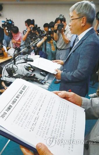 9일 오전 서울 종로구 신문로2가 서울시교육청에서 박건호 교육정책국장 등 교육청 관계자들이 관내 자립형사립고(자사고) 13개교에 대한 운영평가 결과와 자사고 지정 취소 관련 청문 대상 학교를 발표하고 있다.