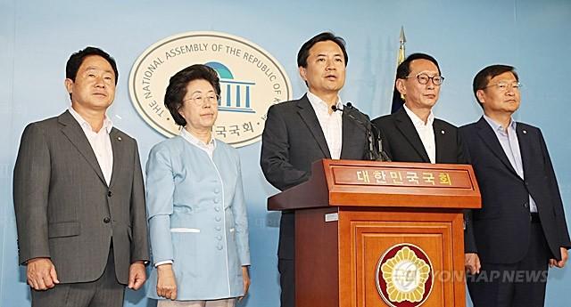 자유한국당 소속 법사위원들이 9일 오전 국회 정론관에서 윤석열 검찰총장 후보자의 자진사퇴를 요구하는 기자회견을 하고 있다. 왼쪽부터 주광덕, 이은재, 김진태 의원, 김도읍 법사위 간사, 정점식 의원.