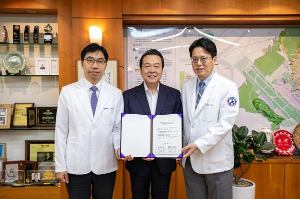 노현송 서울 강서구청장이 9일 마곡동 소재 SNU서울병원과 미세먼지 및 폭염 저감 실천을 위한 업무협약을 체결했다. 사진은 이날 협약식에서 노 구청장(가운데)과 SNU서울병원 관계자들이 협약서에 서명한 후 기념촬영을 하는 모습. (사진제공=강서구청)