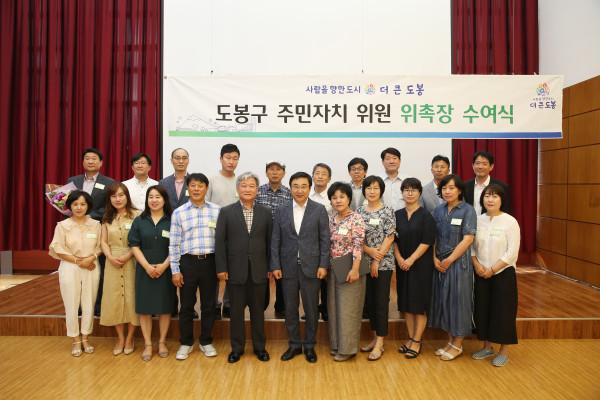 서울 도봉구는 9일 구청 16층 자운봉홀에서 주민자치위원 위촉장 수여식을 개최했다. 이날 이동진 구청장은 신규 및 재위촉된 주민자치위원들에게 위촉장을 수여했다. 사진은 이 구청장(앞줄 가운데)과 주민자치위원들이 기념촬영을 하는 모습. (사진제공=도봉구청)