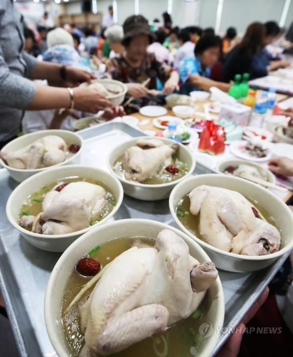 10일 오전 경기 수원시 권선구 평동 행정복지센터에서 열린 사랑의 삼계탕 나눔 행사에서 평동새마을부녀회 회원들이 지역내 노인들에게 삼계탕을 나눠주고 있다.