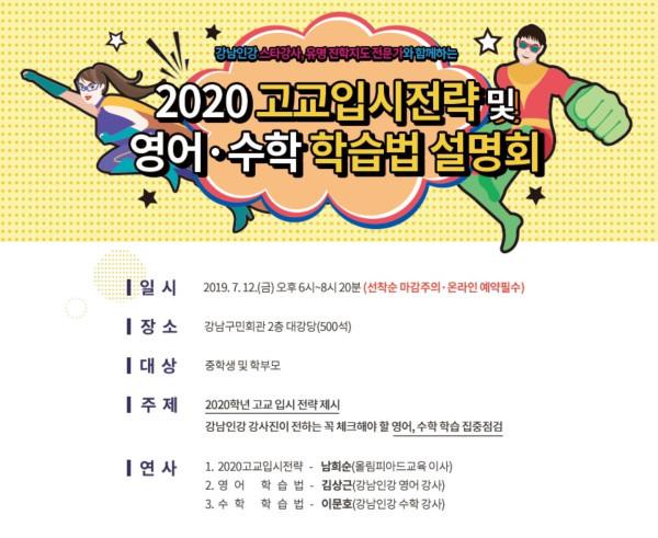 [시민일보=이대우 기자] 서울 강남구(구청장 정순균) 인터넷수능방송(강남인강)이 지역내 중학생·학부모를 대상으로, 오는 12일 오후 6시 대치동 강남구민회관 대강당에서 ‘2020 고교입시전략 및 영어·수학 학습법 설명회’를 개최한다.