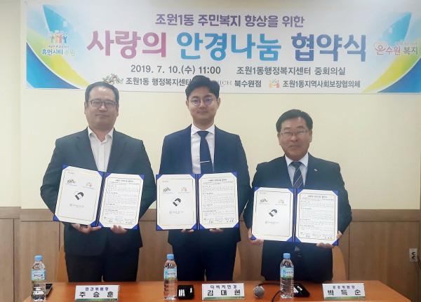 경기 수원시 장안구 조원1동에서는 10일 박득순 동장을 비롯한 주승훈 지역사회보장협의체 위원장과 다비치안경 북수원점 김대현 점장 등이 참석한 가운데 조원1동 주민복지 향상을 위한 '사랑의 안경 나눔 협약식'을 개최했다. 사진은 협약식에 참여한 관계자들이 기념촬영을 하는 모습. (사진제공=수원시청)