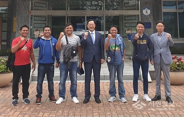 | ▲ 해남군이 농촌일손 부족 해소를 위해 도입한 외국인계절근로자들의 사전교육에 앞서 명현관 해남군수(가운데)가 김성현 농정과 농사팀장(오른쪽 첫 번째)과 기념사진 좔영을 함께하고 있다. | ||