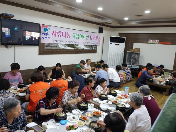 경기 평택시 비전1동 주민자치위원회는 최근 초복을 맞이해 지역내 저소득 홀몸노인 30명에게 보양식을 대접하는 '효잔치'를 개최했다. 이날 위원 20명은 삼계탕 등의 음식을 준비하고 선물을 전달했다. 사진은 노인들이 식사를 하고 있는 모습. (사진제공=평택시청)