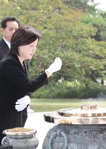 정의당 심상정 신임대표 등 지도부가 14일 서울 동작동 국립묘지를 찾아 현충탑 앞에서 분향하고 있다.