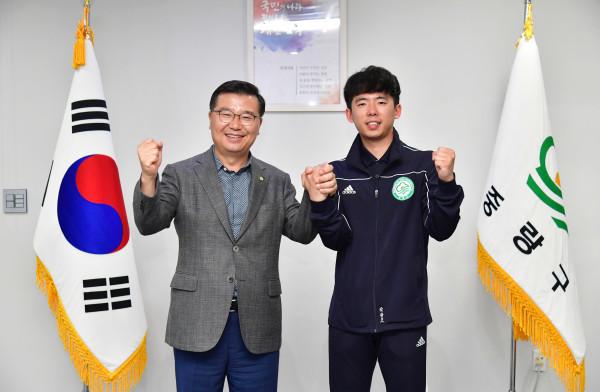서울 중랑구청태권도부 소속 박광호 선수가 최근 열린 2019 나폴리 하계 유니버시아드 대회에서 남자태권도 품새 단체전에서 금메달을 차지했다. 이에 류경기 구청장은 오정환 구청태권도부 감독과 박 선수를 초청해 금메달 획득을 축하하며 격려하는 시간을 가졌다. 사진은 류 구청장(왼쪽)과 박 선수가 기념촬영을 하는 모습.(사진제공=중랑구청)