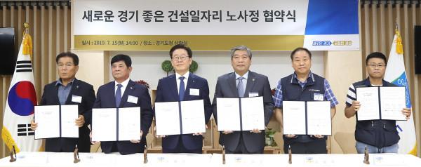 15일 경기도청에서 ‘건설일자리 노사정 협약식’이 개최됐다. 이날 송한준 의장, 이재명 지사 등은 건설산업 경쟁력을 높이는 데 함께 노력하기로 했다. 사진은 송 의장(오른쪽 세 번째)과 이 지사 등이 협약 체결 후 기념촬영을 하는 모습. (사진제공=경기도의회)