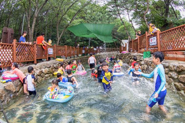 | ▲ 2018년 개장한 '천마산 자연 어린이물놀이장'에서 어린이들이 물놀이를 즐기고 있다. (사진제공=계양구청) | ||