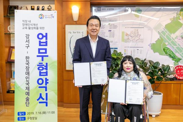 서울 강서구는 16일 한국장애인국제예술단과 ‘직장내 장애인식개선 교육’ 업무협약을 체결했다. 협약에 따라 양 기관은 장애인식개선 교육 활성화를 위해 힘쓴다. 사진은 노현송 구청장(왼쪽)과 장애인국제예술단 대표가 기념촬영을 하는 모습. (사진제공=강서구청)