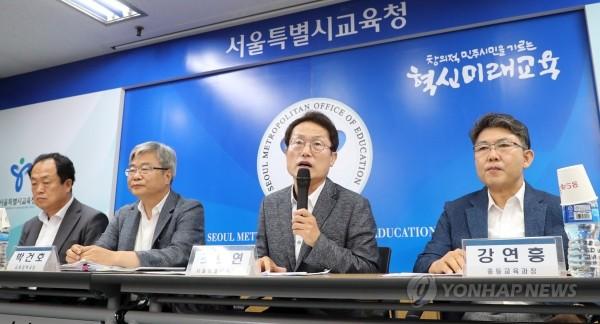 조희연 서울특별시교육청 교육감이 17일 서울시교육청에서 열린 기자간담회에서 일반고 전환 자사고에 대한 동반성장 지원방안을 포함한 일반고 종합지원계획을 발표하고 있다.