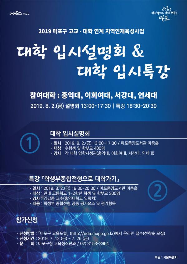 [시민일보=홍덕표 기자] 서울 마포구(구청장 유동균)가 오는 8월2일 오후 1시 마포중앙도서관에서 대입수험생과 학부모를 대상으로 대학입시설명회 및 입시특강을 연다.