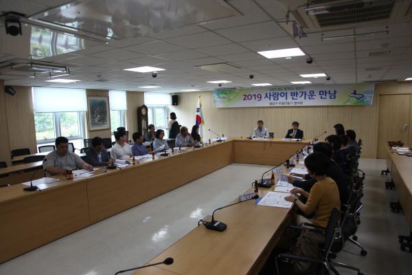 경기 수원시 팔달구는 16일 팔달구청 상황실에서 민경록 구 협의회장을 비롯한 각 동 협의회장과 사무국장 등 20명이 참석한 가운데 마을만들기협의회 7월 중 월례회의를 개최했다. 사진은 참여자들이 회의하는 모습. (사진제공=팔달구청)