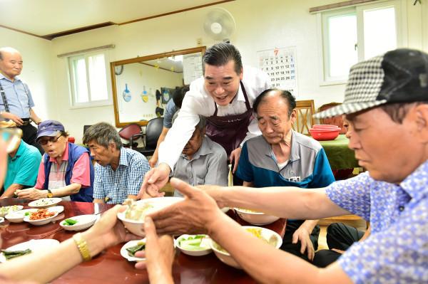 18일 신상균 서울 양천구의회 의장이 신정3동 새마을부녀회가 구립 ‘꽃사슴 어르신사랑방’에서 개최한 ‘어르신 삼계탕 대접 행사’에 참석해 부녀회 회원들을 도와 배식봉사를 실시했다. 사진은 삼계탕 배식을 하고 있는 신 의장의 모습. (사진제공=양천구의회)
