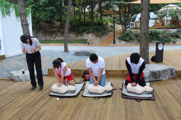 경기 이천소방서가 최근 지역내 물놀이 시설인 '테르메덴'에서 여름철 물놀이시설 안전점검 및 안전사고에 대비한 시설 관계자 안전교육을 실시했다. 이날 소방서 예방대책팀은 심폐소생술, 응급상황 발생시 대처요령 등을 교육하고 시설을 점검했다. 사진은 심폐소생술 교육 모습. (사진제공=이천소방서)