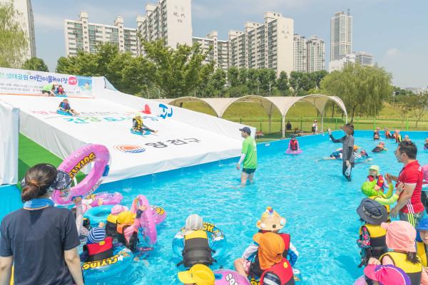 서울 양천구가 오는 8월18일까지 유수풀, 에어바운스, 물총놀이터 등 풍성한 물놀이 기구가 있는 '양천구 안양천생태공원 어린이물놀이장'을 무료로 운영한다. 사진은 물놀이장을 방문한 아이들이 에어슬라이드를 타고 있는 모습. (사진제공=양천구청)