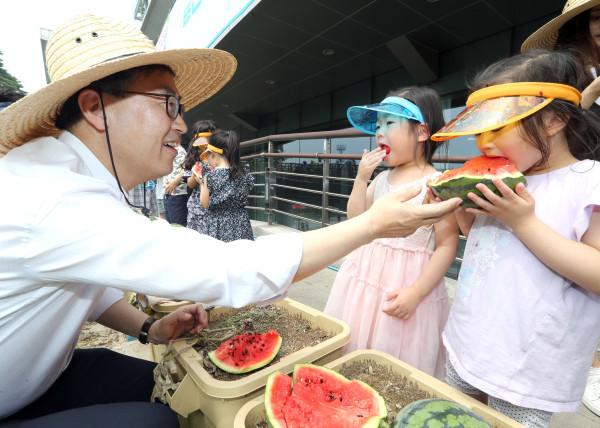 서울 금천구는 최근 구청에 조성된 금나래하늘텃밭에서 어린이집 아이들과 ‘수박따기’ 체험 행사를 가졌다. 사진은 유성훈 구청장(왼쪽)이 수박따기 체험 행사에서 딴 수박을 쪼개 아이들에게 나눠주는 모습. (사진제공=금천구청)