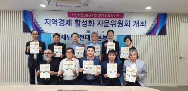경기 안산시는 최근 지역경제활성화 자문위원회를 열고 안산사랑상품권 다온의 조기 소진 대비와 유통 확산을 위해 발행액을 기존 200억원에서 300억원 규모로 확대하기로 했다. 사진은 위원들이 홍보 소책자를 들고 기념촬영을 하는 모습. (사진제공=안산시청)