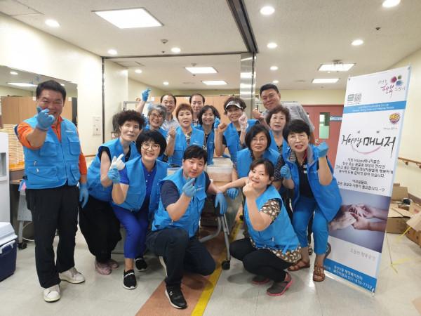 경기 의정부시 송산권역 Happy매니저와 천사보금자리의정부지회는 최근 의정부장애인종합복지관을 방문해 노인 350여명에게 팥빙수를 나눠줬다. 사진은 이날 Happy매니저들이 노인들에게 팥빙수를 전달한 후 손하트를 하는 모습. (사진제공=의정부시청)