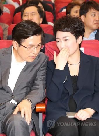 자유한국당 황교안 대표(왼쪽)가 22일 오후 국회 의원회관에서 열린 무소속 이언주 의원의 ‘나는 왜 싸우는가’ 출판리셉션에 참석해 이 의원과 대화하고 있다.