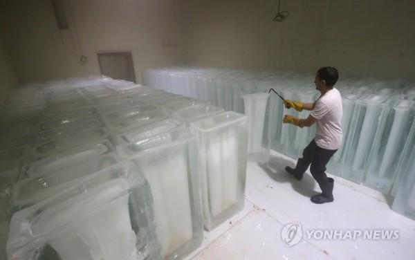 중복 더위로 후텁지근한 날씨를 보인 22일 오전 경기도 부천시 오정구에 위치한 얼음 전문업체 대원냉동산업사 직원들이 수산물 시장 등에 납품할 얼음들을 냉동창고로 옮기고 있다.