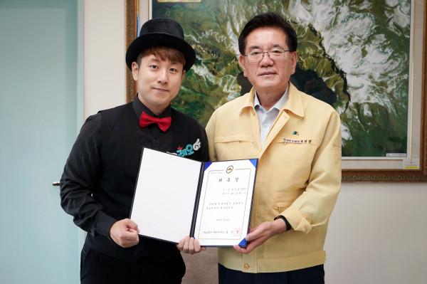 서울 동대문구가 22일 구청 5층 구청장실에서 ‘동대문구 홍보대사 위촉식’을 열고, 마술사 레오를 홍보대사로 위촉했다. 사진은 유덕열 구청장(오른쪽)이 위촉장을 수여하고 기념촬영을 하고 있는 모습. (사진제공=동대문구청)