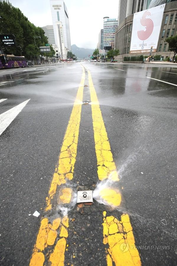 23일 오전 서울 중구 서울광장 앞 세종대로 중앙선에 설치된 클린로드에서 물이 분사되고 있다. 서울시는 클린로드가 6월15일부터 9월15일까지 야간에 한번만 작동했으나, 여름철 폭염에 대비해 22일부터 하루 3번 가동한다고 밝혔다.