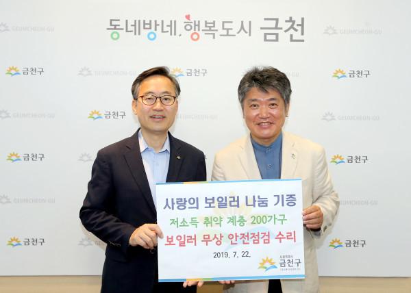 서울 금천구는 지난 22일 저소득층 가정의 보일러 무상 안전 점검 수리·교체 봉사를 위한 ‘사랑의 보일러 나눔’ 기증식을 개최했다. 지역 봉사단체 ‘사랑의 보일러 나눔’은 오는 11월까지 지역내 취약계층 200가구를 대상으로 보일러 사전 안전점검과 수리 및 교체 등 재능기부 자원봉사를 실시한다. 사진은 유성훈 구청장(왼쪽)이 안용묵 사랑의 보일러 나눔 대표와 기념촬영을 하는 모습. (사진제공=금천구청)