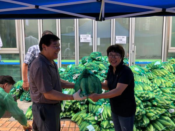 서울 성동구는 금호2·3가동과 자매결연을 맺은 강원도 홍천군 북방면의 특산물 판매를 위해 최근 금호2·3가동 주민센터 앞 마당에서 ‘옥수수 직거래장터’를 개최했다. 사진은 장터에 방문한 주민이 옥수수를 사고 기념촬영을 하는 모습. (사진제공=성동구청)
